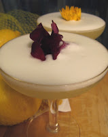 I was going to make a Pisco Sour – and then a wave of creativity hit me. Ok, a little wave… I just changed a couple of things from the Pisco Sour recipe and left out the egg white. What a wonderful result. I just had to share it with you Sipsters!1 1/2 ounces pisco3/4 ounce freshly squeezed lemon juice1 ounce Sonoma lavender syrupDash peach bitters Edible flower (garnish)Shake all liquid ingredients with ice. Strain into a cocktail glass. Float an edible flower on the surface of the drink.My second round of this drink included the egg white, and excuse me for saying that it was pretty freakin’ fantastic.Salud!